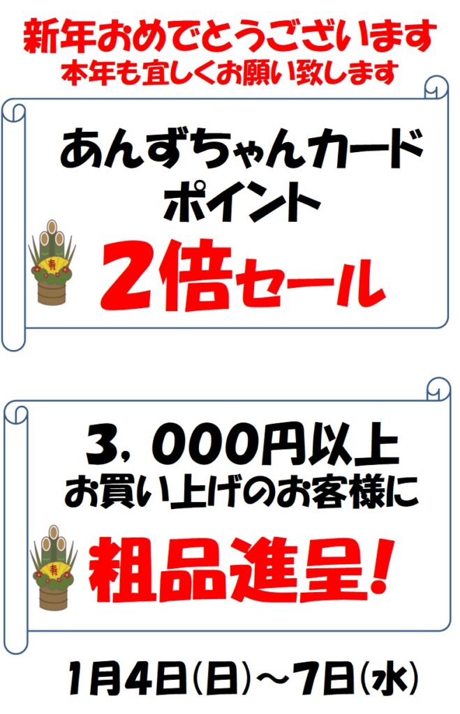 1月4日 新年初売り! 2025/12/31 最終更新日時 : 2025/12/31 furuyahyakka-post 1月4日(日)から7日(水)まで、 あんずちゃんカードポイント2倍セールを開催します。 また、3,000円以上お買い上げのお客様に、 粗品進呈いたします。